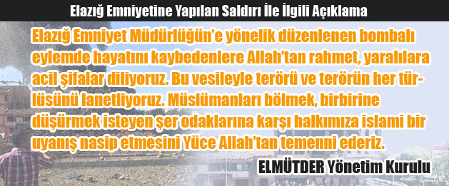 Elazığ Emniyet Müdürlüğün’e yönelik düzenlenen bombalı eylemde hayatını kaybedenlere Allah’tan rahmet, yaralılara acil şifalar diliyoruz. Bu vesileyle terörü ve terörün her türlüsünü lanetliyoruz. Müslümanları bölmek, birbirine düşürmek isteyen şer odaklarına karşı halkımıza islami bir uyanış nasip etmesini Yüce Allah’tan temenni ederiz.