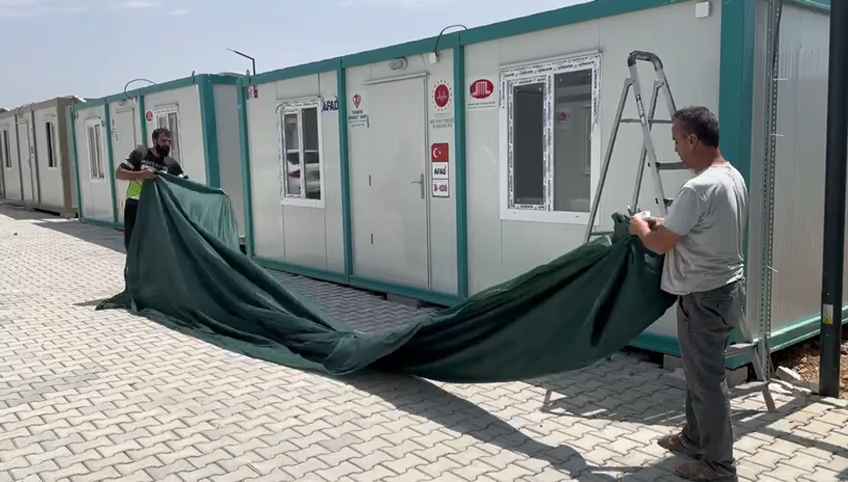 İnşaat Müteahhitleri Derneği depremden en çok etkilenen Hatay’ın hassa ilçesinde konteyner kentteki vatandaşları unutmadı onlar için gölgelik dikmeye başladı.